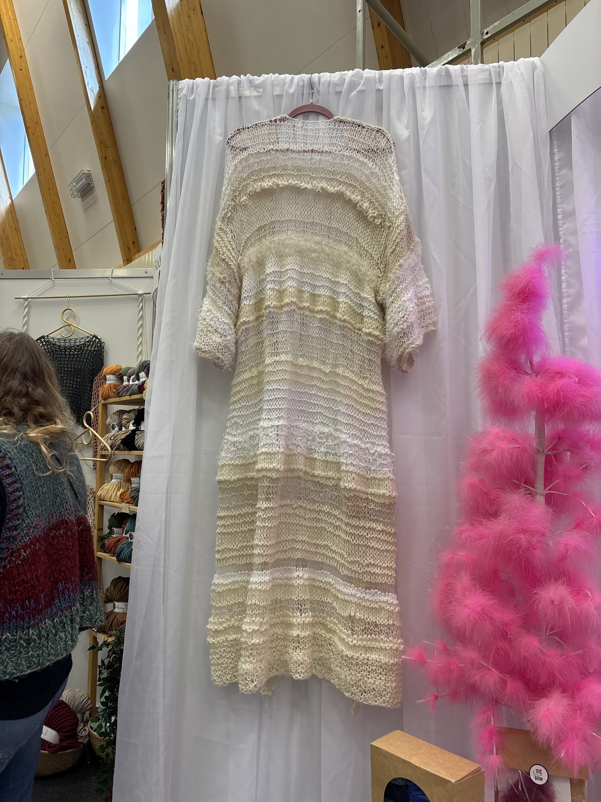 Barinn býður upp á að kaupa smáhnykla af ýmsu tagi, garn sem hefur verið spunnið saman við annað garn til að búa til nýtt og meira að segja efnislengjur sem orðnar eru að garni. Þessi géggjaði kjóll er tþdþ prjónaður úr smáhnyklum af ýmsu tagi og einnig peysan sem sést á neðri myndinni. Hægt er að fá aðstoð hjá listakonunum sem reka barinn – ef hugmyndaflugið nær ekki nógu langt:).